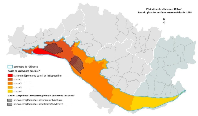 Les propriétaires de terrains et/ou de constructions, ainsi que les Départements et certaines communes du bassin participent au financement de l’assainissement du territoire. Les périmètres de référence sont définis par arrêté interpréfectoral :